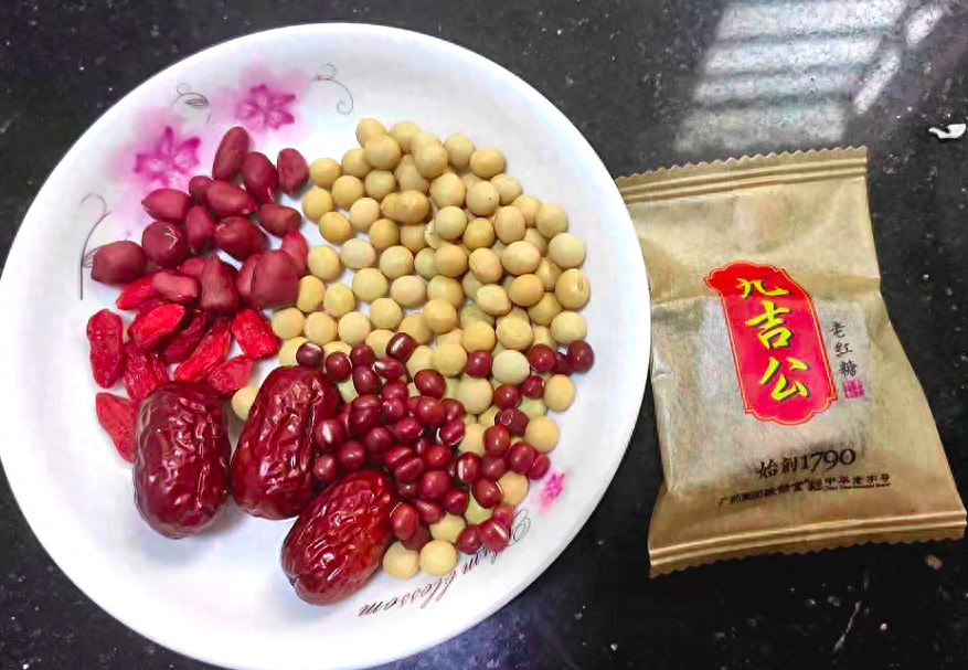 食材:红枣、红豆、红衣花生、枸杞、红糖、黄豆。(各适量根据饮用人数适当增加用量即可)。