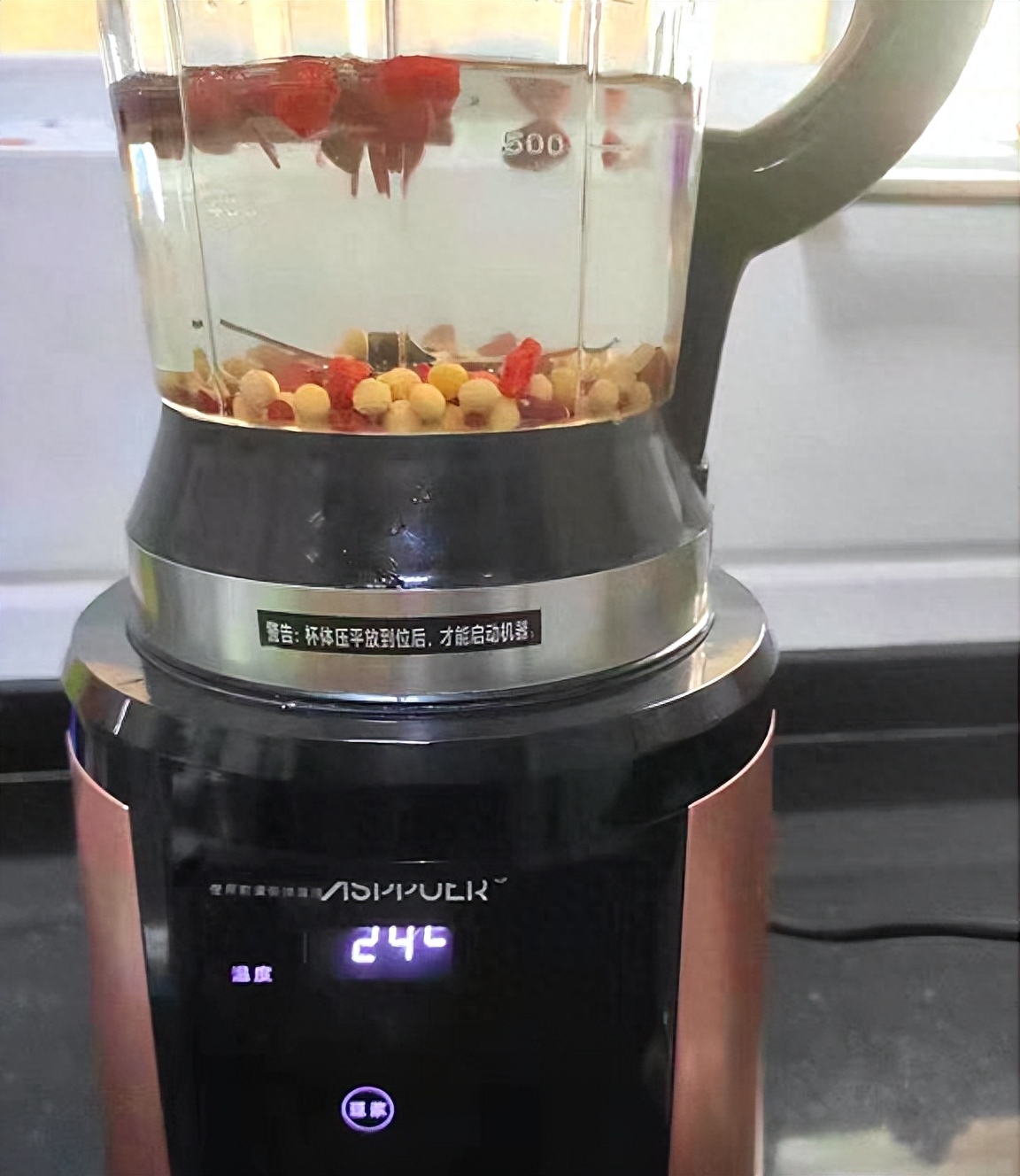 2、把红豆、黄豆、红枣、花生和枸杞一起放入破壁机里,加入适量的纯净水。(建议用纯净水口感会更好哦)。